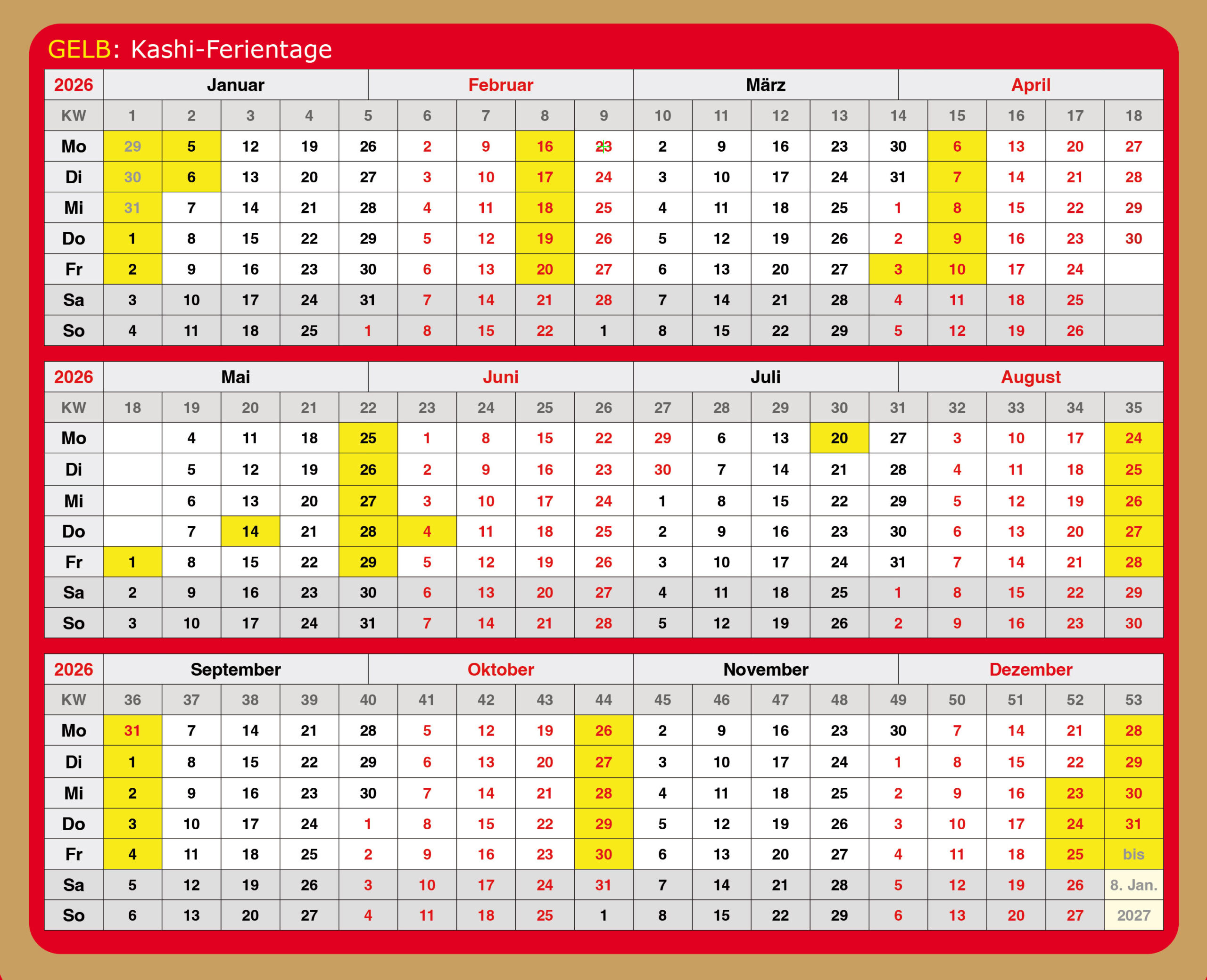Kashi Ferien Kalender 2026 herunterladen
